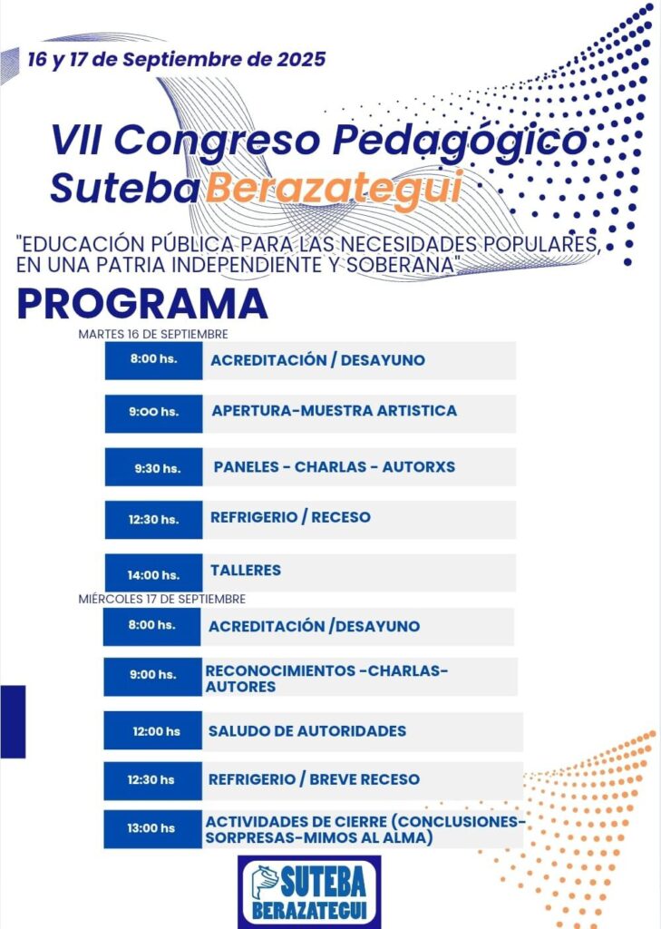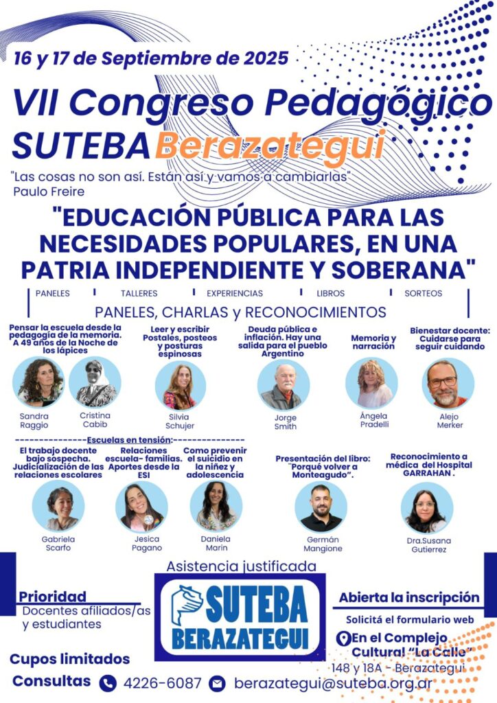 Este 16 y 17 de septiembre, el Complejo Cultural “La Calle” (148 y 18A) será sede del VII Congreso Pedagógico organizado por Suteba Berazategui, un encuentro que reúne a docentes, estudiantes y especialistas en torno a la reflexión y el intercambio de experiencias educativas.