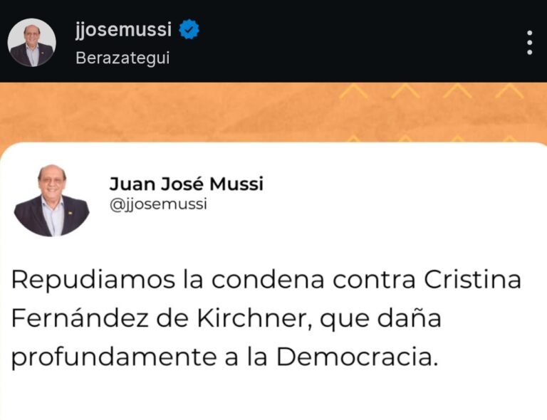 “Repudiamos la condena contra Cristina Fernández de Kirchner, que daña profundamente a la Democracia. La persecución judicial y mediática a la que ha sido sometida la Compañera es inadmisible para cualquier ciudadano o ciudadana. Una justicia sesgada, que no busca la verdad sino que está guiada por el odio y la revancha”, escribió Mussi.