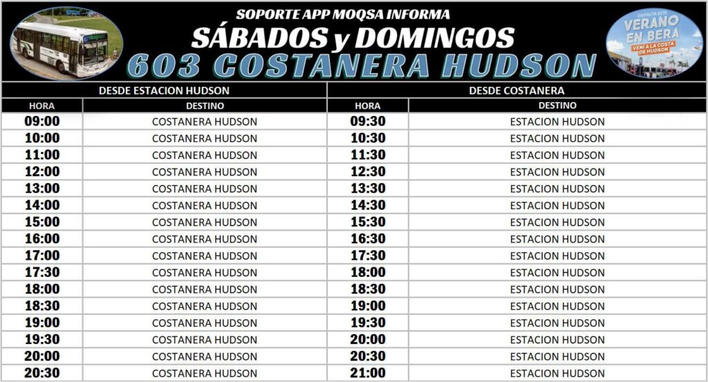 La empresa MOQSA dio a conocer los horarios del colectivo 603, que vuelve a conectar con la Costanera de Hudson.